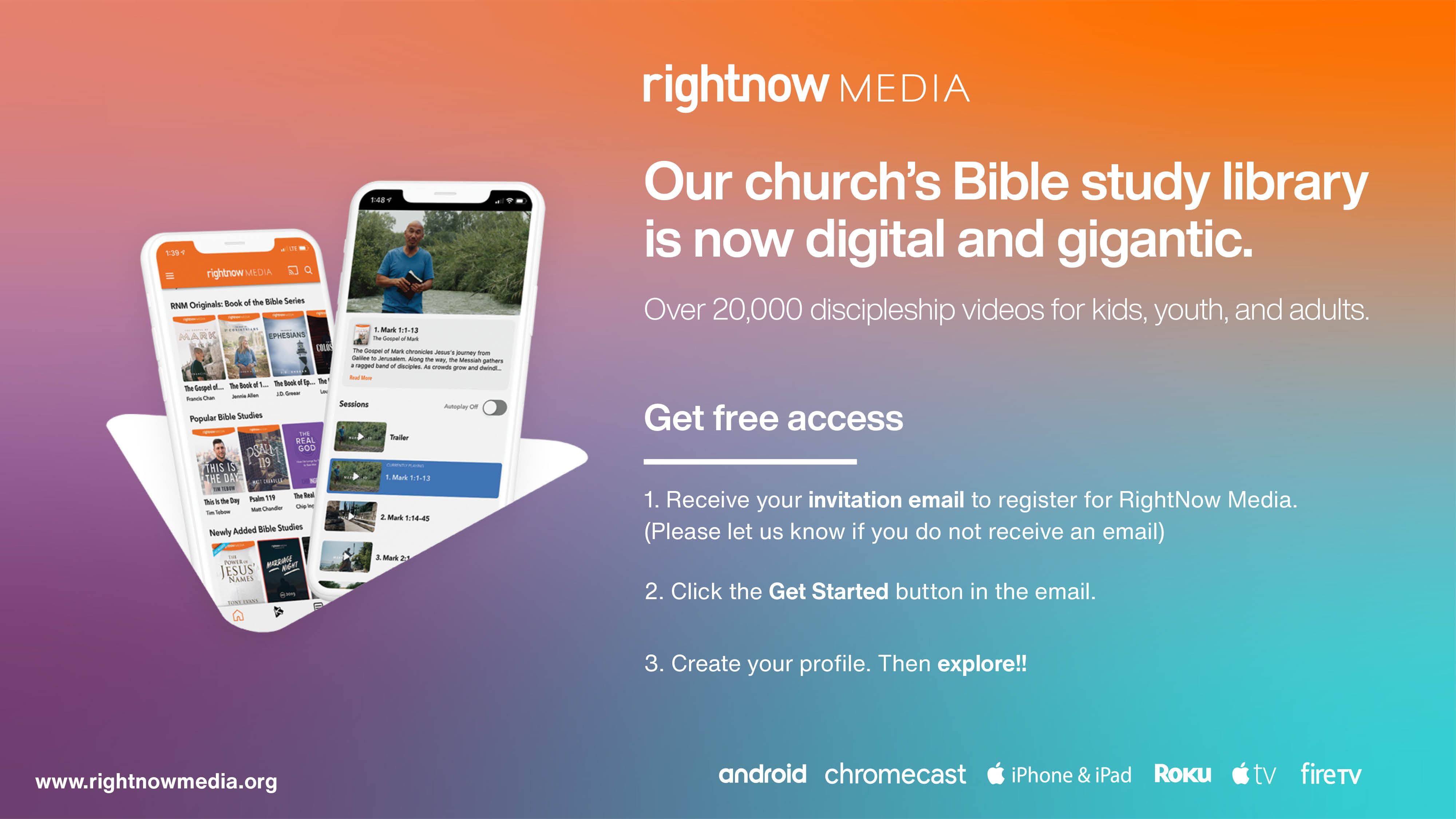 Our church believes that RightNow Media is a tool that can help you live out your faith in every area of your life—at home, at work, and in your community. In addition to series on books of the Bible, RightNow Media has videos for everyone in your family on a variety of topics like marriage, parenting, personal finances, mental health, and more. There’s even a library just for kids with over 2,000 safe, entertaining videos. RightNow Media has a free app that’s available on all major streaming devices so you and your family can access content anywhere, anytime.